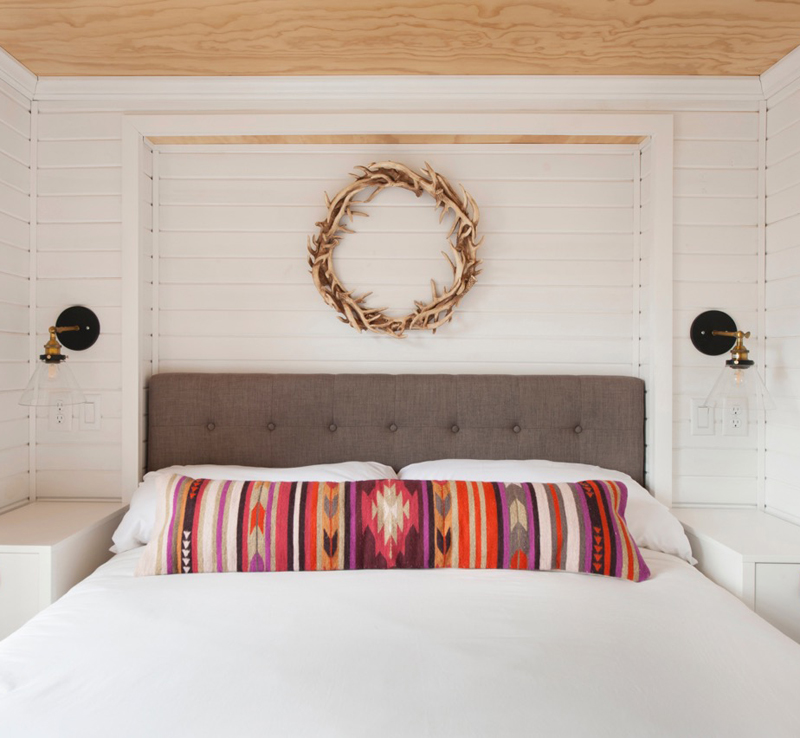 I love this tiny house, it is so clever and cozy! This is the summer home in Three Oaks Michigan (1.5 hours from Chicago) belonging to designer Jorie Burns and her family of 5 + dog. It measures 385 sq/ft (not including the double lofts) and although it is small there is plenty of space for each family member. Jorie about her lovely home: “Our kids are age 11, 8, & 5 and this tiny place makes a huge impact on family time. It really keeps us connected in an otherwise busy world. We do not have internet, and spend most of our time outdoors. Outside we have built a large wrap around screened deck where the kids love to sleep. Sometimes we allow them to bring up friends, but most of the time I cherish it being just us. ” Jorie choose all materials from the plywood ceiling to the tongue and groove wood used on the walls and sourced all furnishings and textiles. Thanks for sharing your beautiful home Jorie! You have done a fantastic job creating a light and airy space where you can have quality family time and creating happy memories!