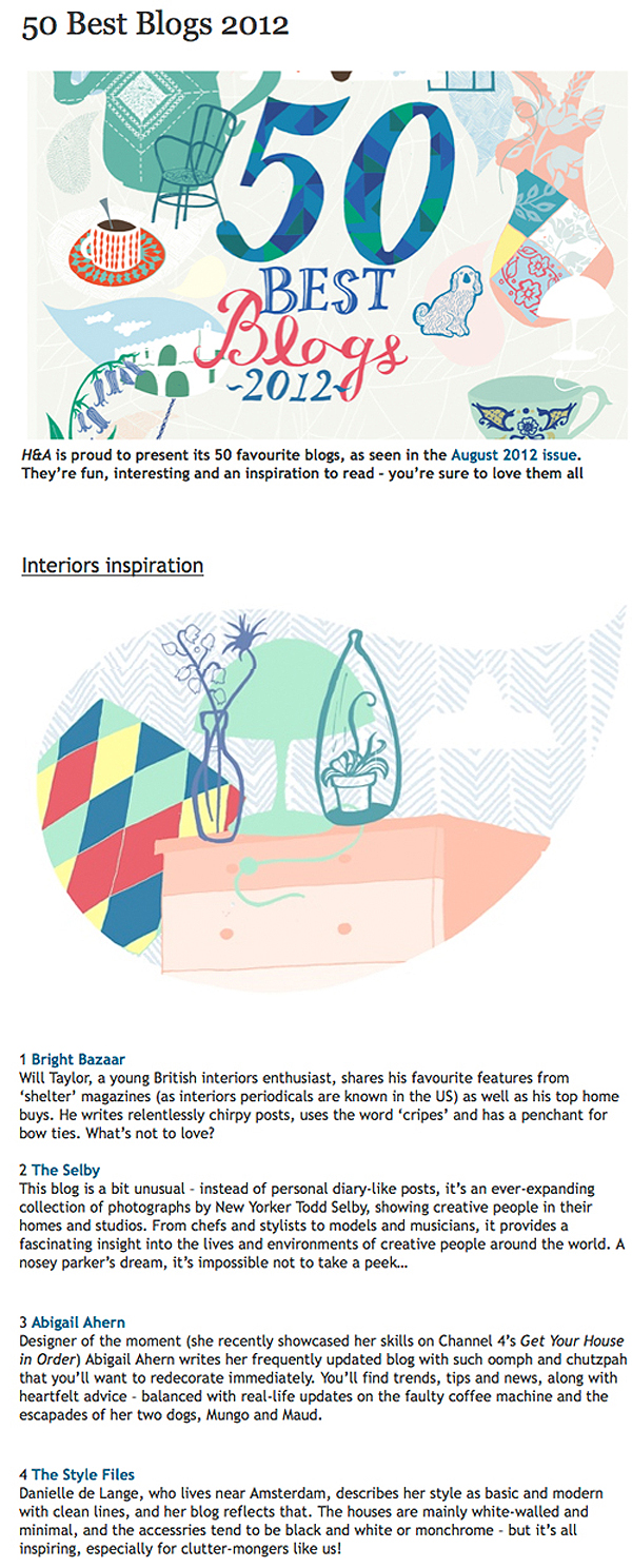 The Style Files was chosen as one of the best 50 blogs by Homes & Antiques magazine (http://www.homesandantiques.com/feature/inspiration/50-best-blogs-2012)
